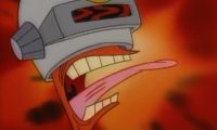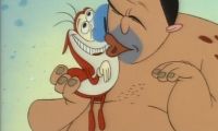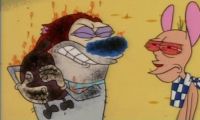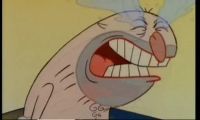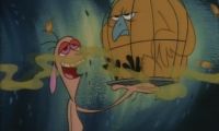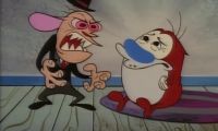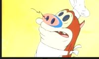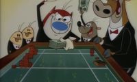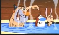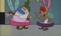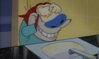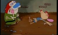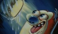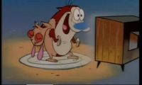 während er fernsieht. Ren zerstört den Fernseher, aber Stimpy hat im Badezimmer