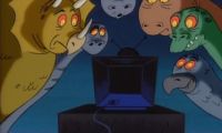 Skelett des Stimpysaurus zu werfen. Wilbur Cobb erzählt ihnen von der Evolution