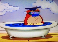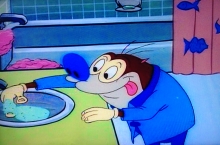 In der Badewanne benutzt Stimpy seinen speziellen Entenhelm, um auf die Fragen der Zuschauer einzugehen.